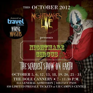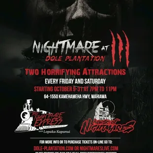 2016 Edition!I first found out about the Nightmares Live haunted attraction a few years ago at Dole Cannery, and I had a blast! Fast forward to the present, and Nightmares Live is still going, but in a new location next to Flora-Dec on Nimitz, and they're even better than before!The quality of their scenes is top notch, and their actors did a great job throught the attraction. You can tell that the layout of the whole attraction is well thought out, and the scare plan was executed perfectly. It also helps when you have a couple screamers in your group to set the mood.They've also got some food vendors on premise, and parking is available at West Marine right across the entrance to Flora-Dec.Nightmares Live is going to be open every night for the week leading up to Halloween, so be sure to check them out before they're gone for another year!