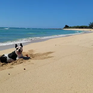 We originally wanted to go to the beach houses but we soon found out that no pets were allowed. I was so sad!!! But luckily, Nimitz Beach was a few minutes away. There's plenty parking!! We were so lucky!!I was sad to see the amount of trash near the road and grassy areas. I mean the trash can is a few feet away. Anyways, the beach itself is beautiful. It's a great view of Honolulu. Our "neighbors" were helpful too. We forgot our hammer to put our stakes in, but thankfully a man let us borrow a hammer. There's a reef barrier near shore and I liked it. It was a safe area for children and dogs to play in :) My dogs LOVED it!I heard that there's a shower there, but we didn't see and there's no bathroom in sight. I would suggest to plan ahead if you'd like to come to this... or else there's Tamura's down the road :)
