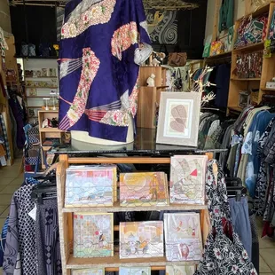 Unique clothing for Men and Ladies. Dresses, Tops as well as Bottoms, many made of cotton, linen, silk, and rayon. There's a "marked down" sales rack with reasonable prices. Many Gift items, such as pins, necklaces made with ceramic, glass beads. Some made with fabric. Coin purses, purses and tote bags. Owner is very helpful with suggestions and advice! You'll be surprised at the variety of gifts for yourself as well as for family and friends.
