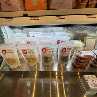 Cute pantry/dry goods stop, bright and welcoming! Treated my friends to their fresh pasta (available in their fridge/freezers) instead of sweets to show my thanks. Cooked the bucatini and sweet potato gnocchi myself and I'm now spoiled and addicted to the textures. Packages seemed each good for two servings when built into a meal. Will visit another time to peruse their tinned fish and other stock.