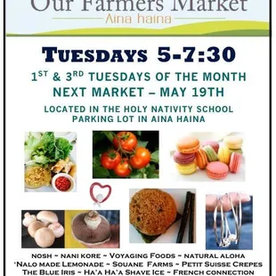 Our Farmers Market is located in the Holy Nativity School parking lot on the 1st & 3rd Tuesday of the month from 5-7:30pm ... they offer a good little selection of food booths, jewelry, produce, kids face painting, balloon art, and plants. The food booths I've seen so far range from kiawe grilled pizza, crepes, organic shave ice, french bakery items, Thai food, Hawaiian food, etc. They seem to be growing every Tuesday and you can follow them on Facebook.... very nice addition to Aina Haina :-) see you all there !Aloha