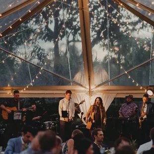 White draping under a clear top tent with Cafe lights and Lanterns