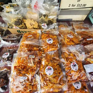 Aunty Patty's the best! The taegu is unbeatable: fish, jerky, clam....and the kim chi is so fresh and crunchy. They sell at Times and Don Quijote but the stadium swap meet has lower prices and more variety
