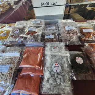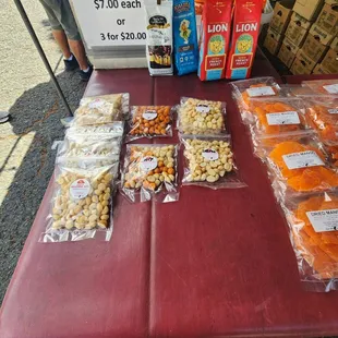 After COVID shutdown, they moved across the aisle at 6C at the Aloha Stadium Swap Meet. They are there Saturdays and Sundays, but not Wednesdays. Wonderful cuttlefish and taegu, we get multiple bags to take home on every trip 2 x $12, The sushi rolls Patty makes are also excellent for a salty, hearty snack while shopping at the swap meet. At $2 each, they are also a solid deal! We also buy the candy, 3 x $5.