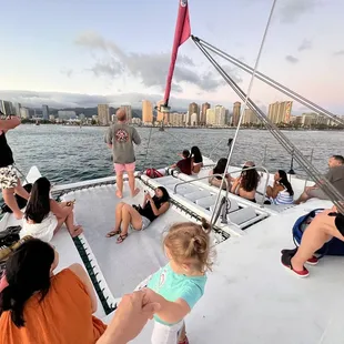 Giving 2 stars due to one crew members rude comment. We booked a sunset splash on Sunday 03/02/25 at 5pm. First, the crew introduced themselves and were engaging with groups for photos. We sailed towards the sunset and then set anchor facing the Waikiki skyline. I thought everything was going well until one of the crew member, Tyler, who I can best describe as one of the guys with the mustache made a crude joke. He started talking about Chinese new years and fireworks. Then he proceed to say, "you heard about Filipino New Years, right? Where they eat dogs?" He then repeated it AGAIN while talking to the other worker John and he didn't get it. But when he walked past me; I told him that joke was offensive. He just looked at me and went downstairs. That's pretty offensive and put a damper on the whole sunset sail itself. I still tipped the crew $20 because I know they have to earn a living but I left feeling offended and hostile. Please train your crew to do better, especially Tyler. I am showing the very little picture I have from the cruise because I wish I didn't book this excursion.