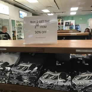 I should have gotten our sales girls name. We saw some cute tshirts and went in. She was so helpful telling me which area of the store had men's and women's clothes. I chose a shirt and she got it out for me. I wanted another one but they didn't have the size I wanted in that print.She was nice enough to tell us about the Buy One, Get One half off sale.Nice girl and it was a pleasant experience. Not like we were bothering her.