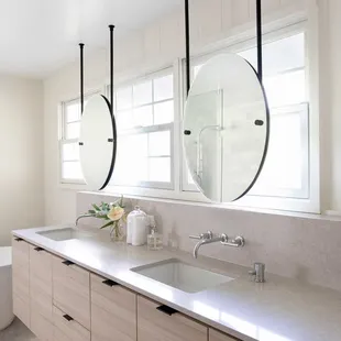 Hideaway laundry hampers and bathroom vanity in light walnut finish. Locally made in Hawaii.