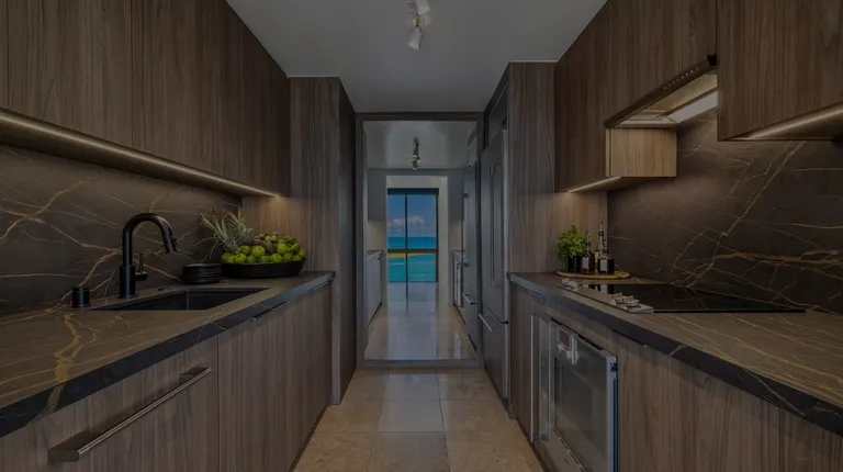 Large U-shaped kitchen features two-tone cabinetry, automated upper cabinet doors, integrated storage features and an appliance garage.