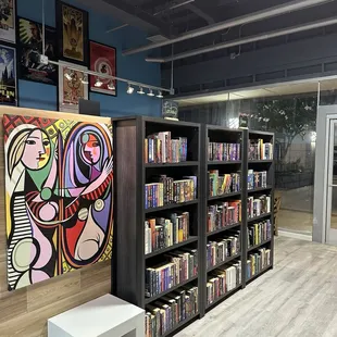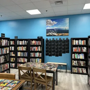 What a cute placeMoviesDVDscdsKids toys and activitiesReading tablesA little cafeteria areaLike library meets cafe meets little store very cute!!