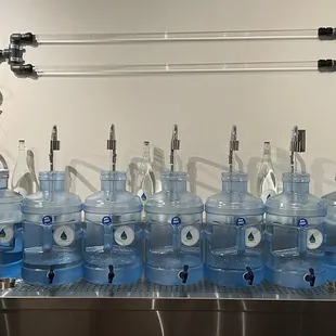 a row of blue, black, and white water bottles