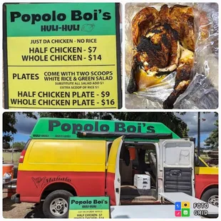 Food - 4.5 starsService - 4 starsPrice - 4 stars (reasonable)Finally - the stars were aligned, we passed by when Popoloi Boi's truck was there AND we needed dinner. Hubby was the one who noticed and mentioned it since I had told him previously that I wanted to try the chicken. Service - as mentioned in some other reviews - efficient but he was not in a talkative mood even though there was no one behind me. Chicken - awesome! Picked up a whole chicken for $14. Got home and - Not too burnt so I was very happy. Juicy and very tasty. Hubby even commented on how tasty it was. Flavor is slightly different from traditional Huli Huli, I couldn't put my finger on it, but it was delicious so the extra ingredient works!Menu out front so you know up front what you can get. Half or whole chickens, half or whole chicken plates, drinks. There were cans on the table so I guess that's what he had for the day? Second table has another small sign lying flat on it that listed the various drink offerings. Since I wasn't getting any I didn't inquire about the day's availability. Will I be back? Of course, the chicken was so delicious! Hopefully hubby will notice again the next time since he really liked the chicken, too.Only for the one photo cuz I was so excited to finally get some chicken that I ran out with just my wallet and no phone. Photo is a drive by as we were leaving, asked hubby to drive by slowly so I could snap a pic.