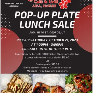 Had this place saved for the longest time and I finally got to try their plate lunches, so worth the wait! 'UH Sports Special': combination plate with steak, garlic fried chicken, luncheon meat, and salmon katsu (ahi katsu +$2) my favorite meats were the steak and surprisingly the luncheon meat too! the steak was seasoned perfectly and cooked well done, but wasn't chewy at all! the luncheon meat was like ham but not super salty, I didn't expect to like it as much as I did! 'Firecracker Chicken Plate: the batter was nice and crispy, crunchy, with a slightly sweet sauce and spicy mayo on top. the inside was juicy and overall, it was very flavorful! Each plate comes with 2 scoops of rice and a scoop of mac salad. I really liked the mac salad, it wasn't too heavy in the mayo taste, but my only complaint was the rice was a bit on the mushy side...This place is takeout only btw!! Located in a small busy plaza, there is also limited parking there.