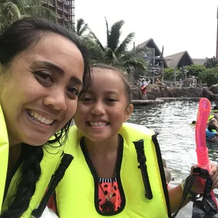 Located at Aulani, Disney's resort and Spa, this is perfect for kids who are afraid of sharks, waves, sharp coral, vana, and other unpredictable things that you might come across out in the open sea. There might even be a hidden Mickey in the reef!They provide inflatable life vests that help keep your body horizontal, and the mask/snorkel to help you see the fish. My daughter just used her goggles because she felt more comfortable just breathing above water instead of through the snorkel. So the rules are that you have to use your hands to move (and not your legs) but my daughter was holding onto one of my hands for dear life and I had the gopro in the other hand so I had to use my legs but they don't really want you splashing and kicking your legs. The water is cold, about 10 degrees colder than Lazy River, so it's probably best to go in the late afternoon. I've done this twice. The first time was a few years ago and we lasted all of 3 minutes because it was too cold for my son, and that's the only thing he remembers, so he didn't even want to go this time. This time I took my daughter in the late afternoon at 4pm and we had the entire reef to ourselves. The reef closes at 5pm but after about 30 minutes she had seen enough. It was her first time swimming with real fish and she loved it. However, she did not want to let go of my hand even though she had the aqualung life vest on and can swim in all the other pools by herself. Something about the fish added a new dimension to this swimming adventure for her. COST: $15 adult, $10 all day in/out privileges, you can also pay a little bit more for an entire length of stay in/out privileges. No reservations needed, just walk up to the check in desk and they'll charge it to your room.Is this like the real thing? Of course not. You are at a Disney resort, and everything here has a little bit of make believe. Isn't that why you come here in the first place?