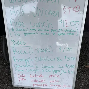 Located in Haleiwa on Kamehameha Hwy. There is no parking lot next to it. There is parking at various places a short walk away. I posted a photo of the current prices as of 5/1/2023. Basically half chicken $7.50 and whole $15.You can see it all cooking in front of you and coming off the spit. It was very good and its worthwhile to get Grandmas sauce, yes its an extra dollar but might as well test it out.It can be busy and take some time but for some good local chicken its worthwhile.