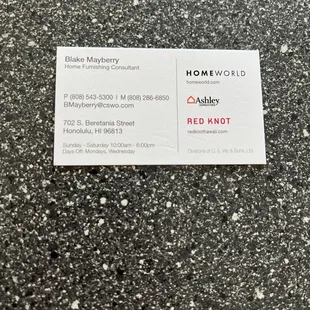 I was in need of a couple rocker/recliners, bunk beds and Blake Mayberry (Home Furnishing Consultant) was absolutely phenomenal. He helped me in every way. Crossed all the T's and dotted all the i's. I would strongly recommend asking for Blake if you need any furniture for you home or apartment. Thanks again Blake. Great job. I have attached a photo of his business card which he sent to me in a thank you card! :-)