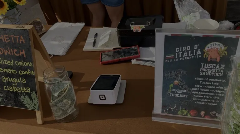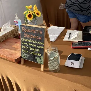 Food: We ordered the porchetta sandwich and it was amazing! You get the crispy ciabatta, leafy arugula, fatty pork with crunchy skin, sweet caramelized onion and tangy tomato confit. Everything works so well together. Service: The lady taking our order was very nice and it didn't take too long to get our food. We just walked down the row of food tents and back.Ambiance: I really liked being able to see the chicken and porchetta being cook on the rotisserie as well as them constructing the sandwich in front of you.Price: it's a little pricey, but the sandwich is so good that I'd say it's worth it.