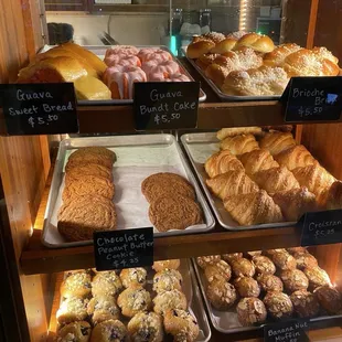lots of baked goods and a few breakfast croissant options. In the halls of the royal hawaiian hotel.great service and beautiful views of the ocean not too far away!