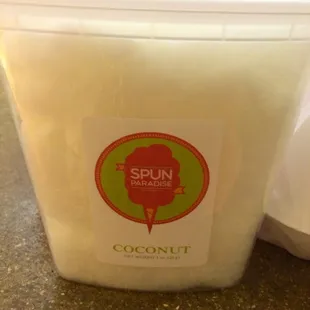 Colorful cotton candy in unusual flavors in containers, made with less sugar than traditional cotton candy! What a concept?!!Tasty and enjoyable and very easy to eat the entire container in one sitting, by yourself, it's that good!Love lilikoi, lychee, and coconut. But there are other flavors too...Try it, you'll love it! Woo hoo!