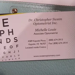 I was referred by a coworker to visit Sween Optometry and I'm glad I did. I had an appointment with Dr. Kent Visher who gave me a thorough eye examination. .Dr. Visher was amazing giving me options on contact usage and lens for my frames. I totally give the entire staff at Sween Optometry 5 Stars. Conveniently located in Costco Kopolei I live in Aina Haina it took me 55 minutes to get there but it was well worth it. I can say I have found my Optometrist and will return often.