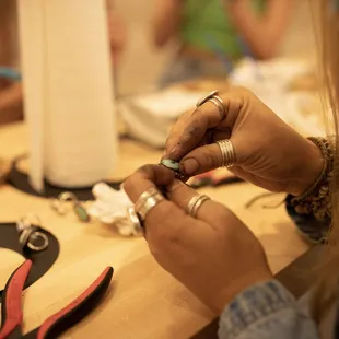 Our family booked a party for jewelry making on Christmas Eve during our staycation. Julia was our instructor, and she was AMAZING!!!In our party we did one pendant, ring stamping, and ring inlay. The gem/shell/glass selection was great! The selection to customize your piece with different accents, so many to choose from! The pricing is great, and the face that you'll have a piece you made yourself and no one else will have something like that, priceless! I purchased a loose stone to return back to make another pendant. TIP: MAKE RESERVATIONS! Otherwise if they do not have time that day, you'll chance not having a spot for class or even getting your permanent piece done. Reservations can be made easily and quickly online.