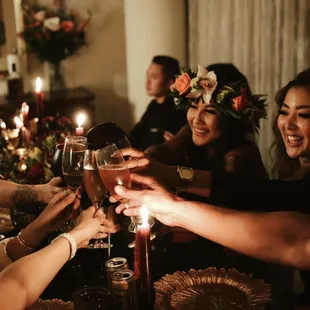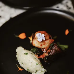 What can I say except the whole experience was just fantastic. From booking, crafting the menu, and then eating said menu, the whole experience was pretty stress free. My friend and I wanted to have a special birthday dinner for our hubs, so we scheduled them on a Sunday night. We provided one main dish which they then crafted a wonderful, balanced menu to complement. They are arrived on time with everything they needed and even though we didn't ask for any special decorations, the simple place settings were a lovely addition and really elevated the whole experience. Dinner started with an arancini crab cake (le amuse bouche). Buttery crab rolled into a crispy ball with a hint of yuzu to awaken the palate. Truly a unique dish the entire party enjoyed.First course was my favorite and consisted of Kona kanpachi carpaccio. Oh my sweet little tastebuds danced for joy as this was one of the best things I've ever eaten. Crispy garlic added a fun crunch, but the magical melding of the flavors in the sauce made everything just melt in your mouth.Second course was a ribeye ochazuke with a mushroom risotto that was so rich and flavorful it almost felt like it hugged your tongue and whispered sweet nothings as you chewed. We opted to upgrade the beef to wagyu so it was beautiful and as someone who doesn't eat red meat, I swapped for scallops. The ribeye was hella tender and the scallops were sheer perfection.A brief intermezzo of li hing calamansi sorbet cleansed the palate and signaled to our stomach to get ready for an onslaught of flavors.The main entree was beef Wellington (ahi Wellington for me) with a potato gratin that was a rich foundation. Everything was cooked to perfection on site, and they even provided a bit of background into their home garden which provides for the herbs and veggies used in most of the dishes. Anyone who knows me, knows I love locally sourced foods (I even buy big island beef for my dog's food), so this was a much appreciated addition.Dessert concluded the meal and while I was sad it was over, the sticky toffee pudding with toasted marshmallow ice cream sent me to cloud 9! If you want to make a special memory for any occasion, book them ASAP! You won't regret it. Chef Kevin and his fiancée are so kind and warm, it felt like family cooking for us. Even though they offer sommelier services, as a practicing oenophile, I crafted the pairings for our party and if I say so myself, I killed it. Looking at the pictures from other events, their decorations are classy and tasteful. Next time we will definitely include more courses and perhaps may splurge on a specially crafted cocktail.