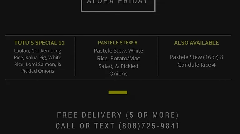 Tutu's Ono Foods is DELICIOUS!!! Perfect for catering graduation parties, birthday parties, weddings or ANY special events! The price is right! They even occasionally do free island-wide delivery (5 plates minimum to order). They are usually at Hawaii Self Storage Kapolei selling their ono grinds on Fridays! Local Family business, very loving, and caring people with great customer service and appreciation for their customers. I suggest to follow them on Facebook and instagram. Just search Tutu's Ono Foods. You will NOT be disappointed!! Ono Laulau, Kalua Pig, Chicken Long Rice, Pastele Stew, Gandule Rice!!!!! Mouth watering!! I'm a loyal customer and my co-workers love ordering from here as well !