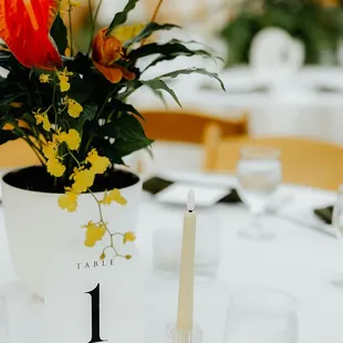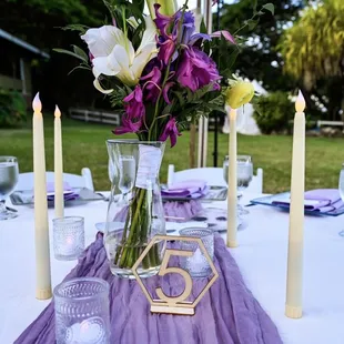 Vases, candle votives, table number, wood rounds-- all rented from WedCycle!
