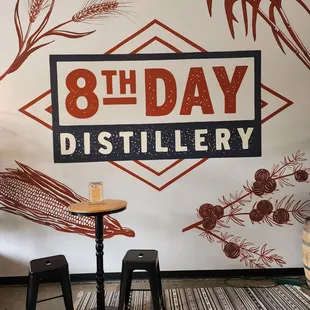 tables and chairs in front of a sign that says 9th day distillery