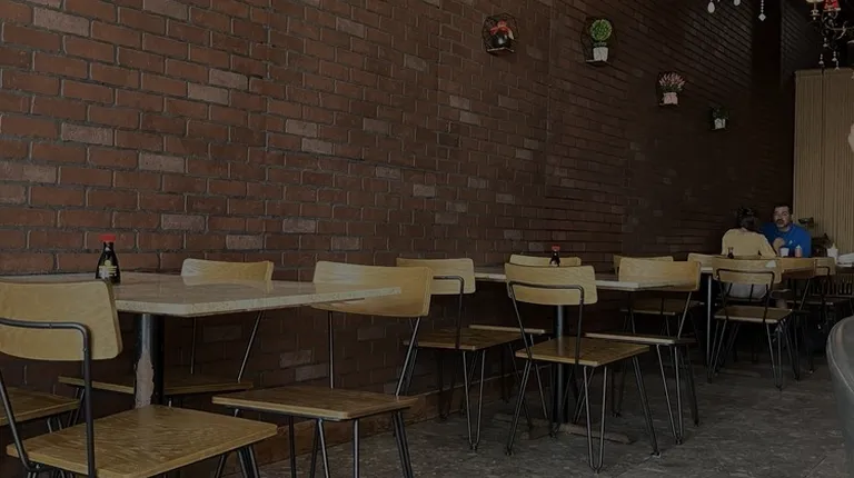 a woman sitting at a table in a restaurant