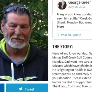 Just would like to say R.I.P. George GreerWorked at Bluff Creek Golf Course They're having an Outing on 8/28 please call Bluff Creek for Details, 422-4736 Please come out and play in memory of George.Thank you Curtis & Marcus Greer Sons of George