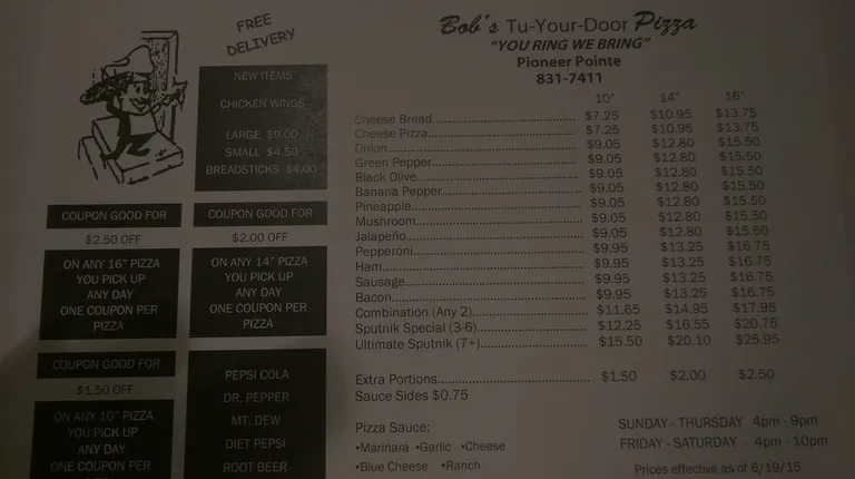 Oh Bob's. So much of me wants to get behind this local pizza place. I just can't.We hadn't ordered from here in years. Having no idea about any specials they might have, I inquired about such during the phone call to order the pizza. They explained that the only specials they offered were through the coupon packs you get in the mail. We then had to go through our mail and frantically hunt down our coupons. Then they pretty much said that most of them weren't going to be valid except for one or two. Fine. Just get us some pizza already.We ended up ordering a large pizza, breadsticks, and a two liter of Coke. The breadsticks are the cheap, out-of-the-package variety. Nothing homemade about those. The crust, well, it tasted exactly like the box it came in. So disappointing! Once we got into the pizza more, I discovered that they put onions on the entire pizza and not just my husband's half. Ugh. Not a fan. We didn't call them back to replace it. It wouldn't have been worth it. We just will never order from there again.Oh and the coupon, they didn't even collect it!