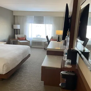 I specifically asked the front desk for a quiet room after not sleeping 2 nights at the Columbia Club hotel, which by the way is a total dive. They placed me on a high floor, very nice, however, the room was closest to the freeway which has two major issues; very loud highway road noise, & vehicle exhaust fumes in the room. Glazed, soundproof windows are a must for any hotel this close to the freeway & the General Manager said they have had complaints & have notified corporate with no solutions in sight. The fumes from the highway caused me to cough throughout the night, and today, one day later, I have a burning & mucus build up in my chest. I can still smell exhaust fumes. I'm very healthy & always have been. Not a me issue. This is a hyper critical issue & I find it remarkable it has not been addressed. I will notify Marriott & Indianapolis authorities overseeing the safety of hotel guests but letting all you of you on Yelp know to avoid staying in rooms closest to the freeway. Ask to be in a room closest to the parking lot. I ate at the restaurant on site. It's ok. Something to eat & the food is not worthy of additional comment.