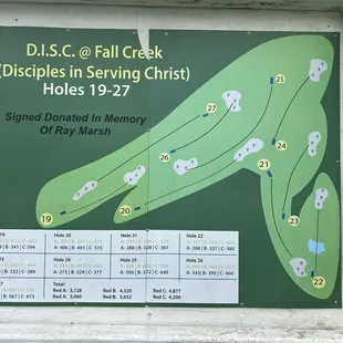 If you're looking for disc golf that is well maintained and offers a variety of levels, this is it! It is a part of a church, so don't be confused when you turn into the parking lot. A large sign at the back offers a map. The first 9 are pretty open, mostly in a field, and great for beginners/warm up. Each hole has two starting spots, helpful if you have kids. The second 9 were so much fun! I think we will start there next time. Definitely in the woods, but not a ton of brush if you go off course. A few shots go along Fall Creek. The final 9 are more advanced, but we didn't make it that far.Each hole and basket is clearly marked and there are maps at the start of each hole to help you direct where to throw. It isn't always immediately obvious where the basket will be.