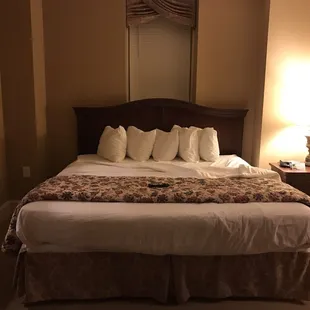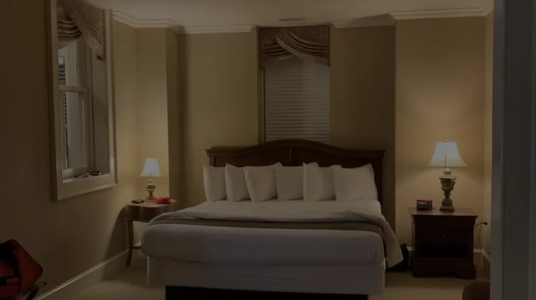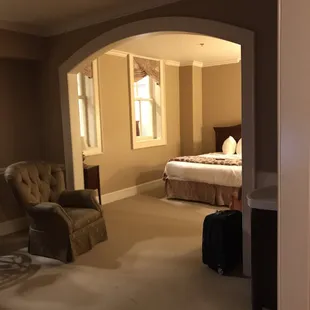 Lovely old historic hotel, but lots of issues... The lighting in the parking lots was very dim so I could barely make out the signs or parking space lines. At first glance the King Suite that I booked was nice, but lots of issues on closer inspection! The carpet is all very old and flat and stained. The bathroom had tiles taped up, indicating it had just been repaired so the room should have been OOO (I worked in hotels as front desk and later Operations Mgr for 16 years). The lampshade as you first walked in had large dust pills on it, which is from it not being dusted for a LONG time before giving it a quick swipe with a rag. The bed was situated so that it was directly across from the door that was just maybe 10 feet away, so the hallway light shone right at your face all night. If I lay facing the other way, the 2nd room's top windows had no shades so the moonlight shone through in my face (full moon). The worst thing was that there was one pillow on the bed, lined up neatly with the other 5, that had a threadbare pillowcase and there was a heavy memory foam pillow inside that was filthy! It looked like a previous guest had left their own pillow behind at some point and it stayed there in the room but OMG it was absolutely disgusting! I put it on the floor and messaged the hotel about it. I didn't even want to use the pillow next to it, it was so nasty looking. Very disappointing stay overall. I will say that the staff was nice and the bed was comfortable.