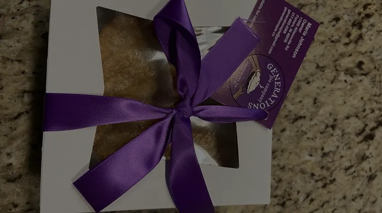 a purple ribbon wrapped in a gift box