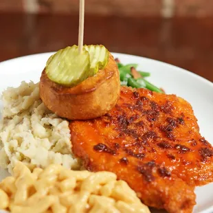 our famous tenderloin, topped with white gravy, green beans, mashed potatoes