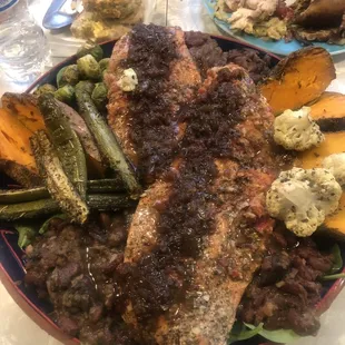 a platter of meat and vegetables