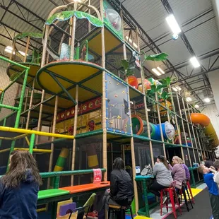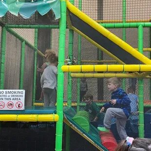 The play equipment is great, very large play area and multiple spots designed for different ages. Very frustrated though as we brought our own play approved socks from a different establishment as we live out of state. The only difference is the name stitched into the socks. There is no safety concern. We go to several similar companies and have never had this issue. The front desk saw the socks initially and didn't have a problem until staff in the play area brought it up. Then it became an insurance liability. It very much seemed like an easy way for them to get another transaction through their system and more money in their pocket. It's a small detail but unfortunately will likely cause us to choose a competitor for future visits to the Indianapolis area. The fact that many items are out of order, staff is inconsistent with enforcing policies (multiple other people were wearing socks from a competitor or just standard socks without a no-slip feature, some rules are ignored, etc) and adults not being permitted to assist their own children if they aren't on the ground floor solidifies that choice not to return.