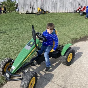 Although Lark Ranch is a good 45 minutes away from Johnson County, it was definitely worth the trip. Recently Lark Ranch was selected as the best pumpkin patch in Indiana by Good Housekeeping! As we pulled down the gravel driveway we immediately noticed several fun activities. The girls were getting all giddy pointing at each activity they could see. The cost is $12 per person. Now that might sound like a lot of money but there are at least 12 activities you and your family can participate in over and over for the price....Climbing WallPillow JumpCorn mazeTrain rideSwingsPedal TractorSeveral wooden playsets for the younger children*Pro tip: One of my favorite activities included the pedal tractors, good for kids and adults. I love when the adults can also participate with the kids.Lark Ranch also serves fair-like food at two different locations. Outside food and drinks are not permitted.