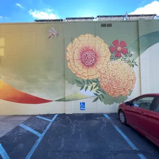 The is a beautiful mural. It overlooks a parking lot that belongs to Marigold Clothing (coincidence, or not?) and is located on the back wall of the Broad Ripple Pub. Marigold clothing is the store to the left, as you are viewing the mural.The mural is the work of Christopher Blice and Jon Edwards of the decorative painting and marketing company Blice Edwards. They painted the mural in 2019. It depicts a small assortment of flowers, featuring a Marigold, hence the name along with a butterfly and a bee. They are set upon a twisted colorful ribbon and a colorful background of mostly yellows and greens. You really need to check out the murals shading while you are visiting. It is amazing. The detail on the mural is awesome. Blice Edwads are very talented and have some really nice pieces across the city.This mural was a nice addition to the area and adds a bit of color. Being that it is in a parking lot, so of it may be obstructed by parked vehicles, but you should still be able to get a good look.Parking to get out and take a closer look at this mural is not an issue. since it over looks a parking lot, be it a private one. But I am sure you will not be there long anyway. There is also some street parking available as well.I was there less than 5 minutes, as with most murals I have visited. So, you may want to consider planning out additional stops at many of the other wonderful murals in the area, or making this stop part of a larger itinerary to maximize your time and trip.