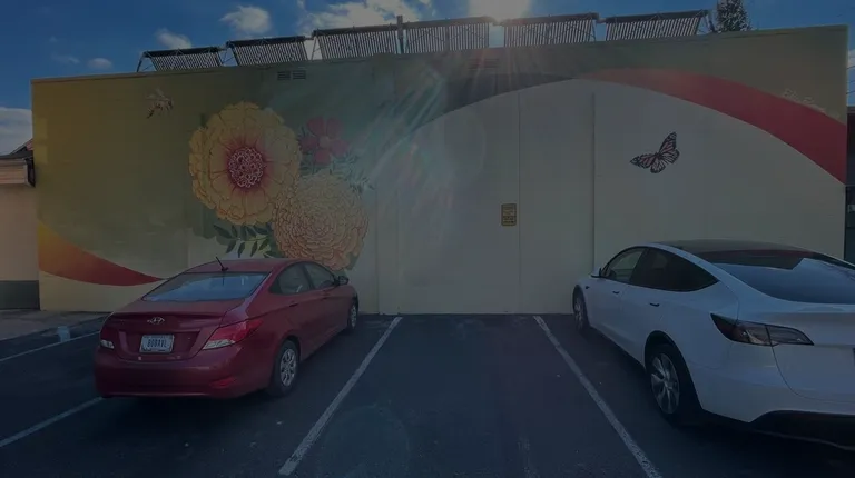One of the more well known artist groups in central Indiana is Blice Edwards. Together since 1993, this partnership between Chris Blice and Jon Edwards has been adding beautiful artwork (primarily paintings) to the area based out of their small studio near 54th Street. This mural "Marigold" was added in 2019 just a short distance north of the studio. There is a shop off Cornell that is called Marigold Clothing which has a small parking lot to the west of the shop. A large wall of Broad Ripple Brewpub is adjacent to the south side of the lot. It is this wall that the team has added giant marigold flowers along with a butterfly and honey bee. A large slightly twisted ribbon arcs across the background of the mural adding a rainbow of color to the wall. All visitors to the shop who park in the lot (rather than street park) will be able to see this unobstructed artwork.For fans of this art, know that you can find other pieces by the duo around town, including up in Westfield (although the piece was a sculpture that is being moved for construction). Down on East Michigan near Mass Ave, a three story image of James Whitcomb Riley was painted. A giant pegboard mural featuring lots of tools is painted at the former Angie's List campus. And all around their studio, including the Posh Petals Floral shop and the patio "Butterflies" of Gallery Pastry Shop, are featured more of the team's work.Review #3328