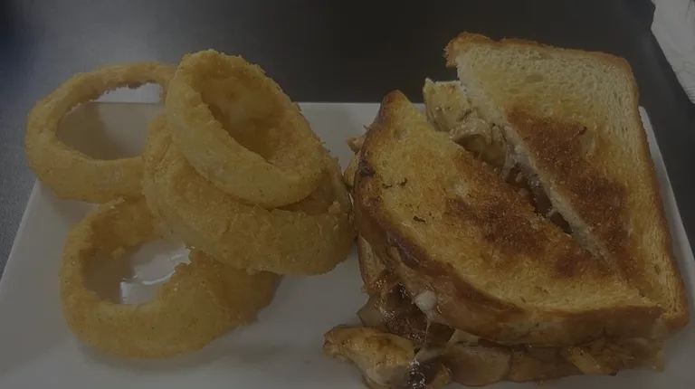 a fried chicken sandwich and onion rings