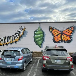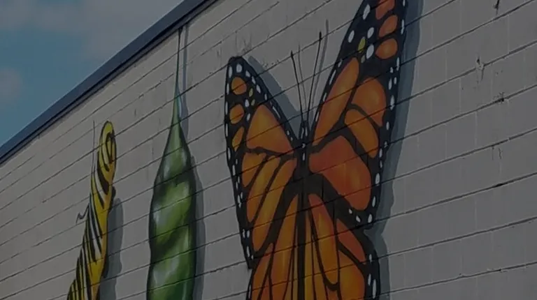 In 2019, three images were added to the side of Horizon House by artist/muralist Jules "MuckRock" Muck. The three colorful paintings of a caterpillar, pupae, and butterfly show the metamorphosis that takes place in becoming the final level of advancement through a life cycle.What makes this mural even better is the placement on the side of Horizon House, a place dedicated to help the homeless transition to becoming self-sustaining and hopefully, better able to live their lives to the fullest.There are a couple other murals at this location, so be sure to check those out if you visit.Horizon House is located along Washington Street just east of where it is crossed by I-65/I-70. Southeastern Avenue begins there and you can pull into a parking lot next to Horizon House on either side of the building off Southeastern.Review #2932