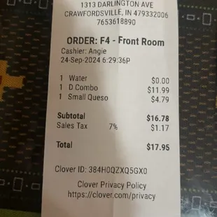 Decent Food, but Watch the PricingThe food was pretty good--good in that way that all Mexican food is good -- and the service was fast and friendly. No complaints there! However, I did run into a small issue with the queso. I ordered the small size (pictured below, though sorry for the half-eaten look LOL. I was starving and forgot to take a picture before eating.). The small was perfect for one person. The menu listed it at $3.99, but my bill showed $4.79. I understand inflation and all that, but if I had known it was nearly $5 for such a small portion, I probably would've just gotten my food to go and picked up a full jar of queso from the grocery store instead lol. Would still recommend!