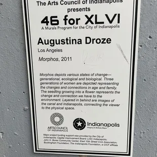 This mural (part of the "46 for XLVI" project in 2011 for the Superbowl hosted in Indy) is one of the most eye catching murals created along the canal. Artist Augustina Droze created "Morphos" to show the metamorphosis of a woman at three stages of life. The larger than life portraits are done in black and white and are very relatable. The artist also adds a full color sunflower and butterfly which undergo much more rapid changes in their brief lifespans. All the images are painted over a backdrop of a map of the canal area.Review #1337