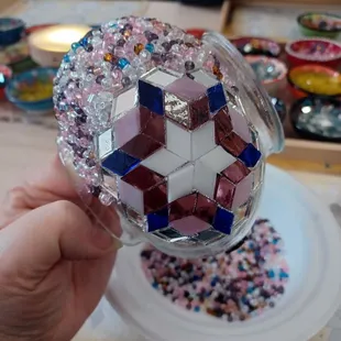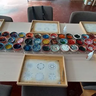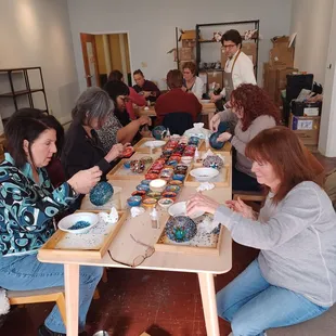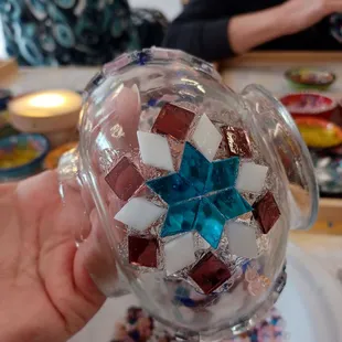 Attended my first mosaic workshop here with a few friends and was amazed at the results. First off this is located at the Stutz building, on the third floor, quite near the elevator, so it's not that hard to find.There are plenty of paid parking lots and street parking available around the area. Keep in mind that street parking is free on Sundays. Communication is outstanding, with reminder e-mails, detailed maps on how to find the studio, where to park and after your class instrutions on applying the grout.But let's get to the classes. Currently this location "only" offers Turkish Mosaic Lamp workshops. However, you can choose your type of lamp, or just a globe or candleholder. Entirely up to you and your budget. It is not cheap, but neither are the materials needed. You will be seated at a tablel with seemingly endless mosaic glass options in so many great colors, it's going to be tough to choose a color combination. There are a few suggestions on their website as far as color combinations go. And of course you will need to decide what type of pattern you will be creating. Another tough decision. You will get a two-sided sheet with various patterns you could follow, or you can feel free to create your own. Our instructor was Kurt, a most patient man, as I dragged about a dozen of folks with me as usual and there were a couple of other folks besides our group and with that every last seat was taken. He answered question after question and refilled bead and glass shapes continuously. Showed us how to glue things in place, made suggestions, helped here and there with project gone awry and somehow still managed to share a bit about his home country of Turkey. There are little lit platforms where you can check what your lamp will look like when completed, and also an actual lamp you can hold your masterpiece to and get a better idea. Once you are done with your pattern, you get to create your own mix of tiny glass beads and apply those in all the 'free' spaces. then you are done with studio time. You are given grout and instructed on how to apply this once your project has reasted at least 12 hours. (you will also get an e-mail the next day, reminding you and a link for the instructions again). You will also get your lamp part , if you chose to make a lamp, and the bulb to go with it. All is neatly in a nice sturdy bag so you can add your globe and your grout to it also and have it all together in one place. Highly recommend this experience and I am hoping that they will add some of the different workshops that are offered at other locations. Fingers crossed.