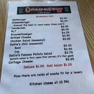 Some friends and I wanted to hit a local, been around "forever" type of bar. We decided on the Red Key Tavern. We walked in to a lively scene of a pub that, we found out, has been in the same family since 1950. There were 6 of us, the waitress moved tables around and we had our spot. We all ordered beers and the some of us decided to get a cheeseburger. Our waitress was the only one in the tavern. She handled it perfectly. She gave us the story about the long family ownership. She checked on us often. She was on her game for sure. The cheeseburger was delicious. It says "often voted best" and I can see why. We wanted potato salad, but it is only there until it sells out. It was sold out - apparently it is that good!One thing to note - Cash only. There is an ATM onsite, but don't go think you'll be using a credit card! You won't.