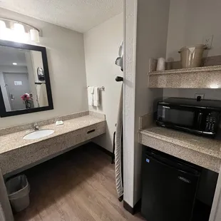 The room is better than my expectation. The room is big enough for my large case fully opened. Has microwave and refrigerator in the room. I guess this room is new renovated so it's pretty new, I like the wood floor bathroom. But the shower curtain has mold