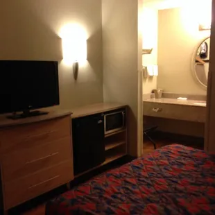 Excellent room, friendly staff. Great amenities, lots of charging ports, nice television for watching, good programming, microwave, refrigerator, clean sheets, clean restroom. Friendly staff. Easy in backslash out check in. Overall great experience.