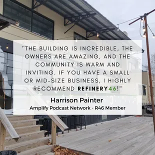 Refinery 46 has been an excellent office space! The tenants are extremely friendly and insightful. Brian Schutt has been incredibly generous with this time helping me grow my business. I highly suggest Refinery 46 to all new businesses because everyone here makes a time for guidance and support.